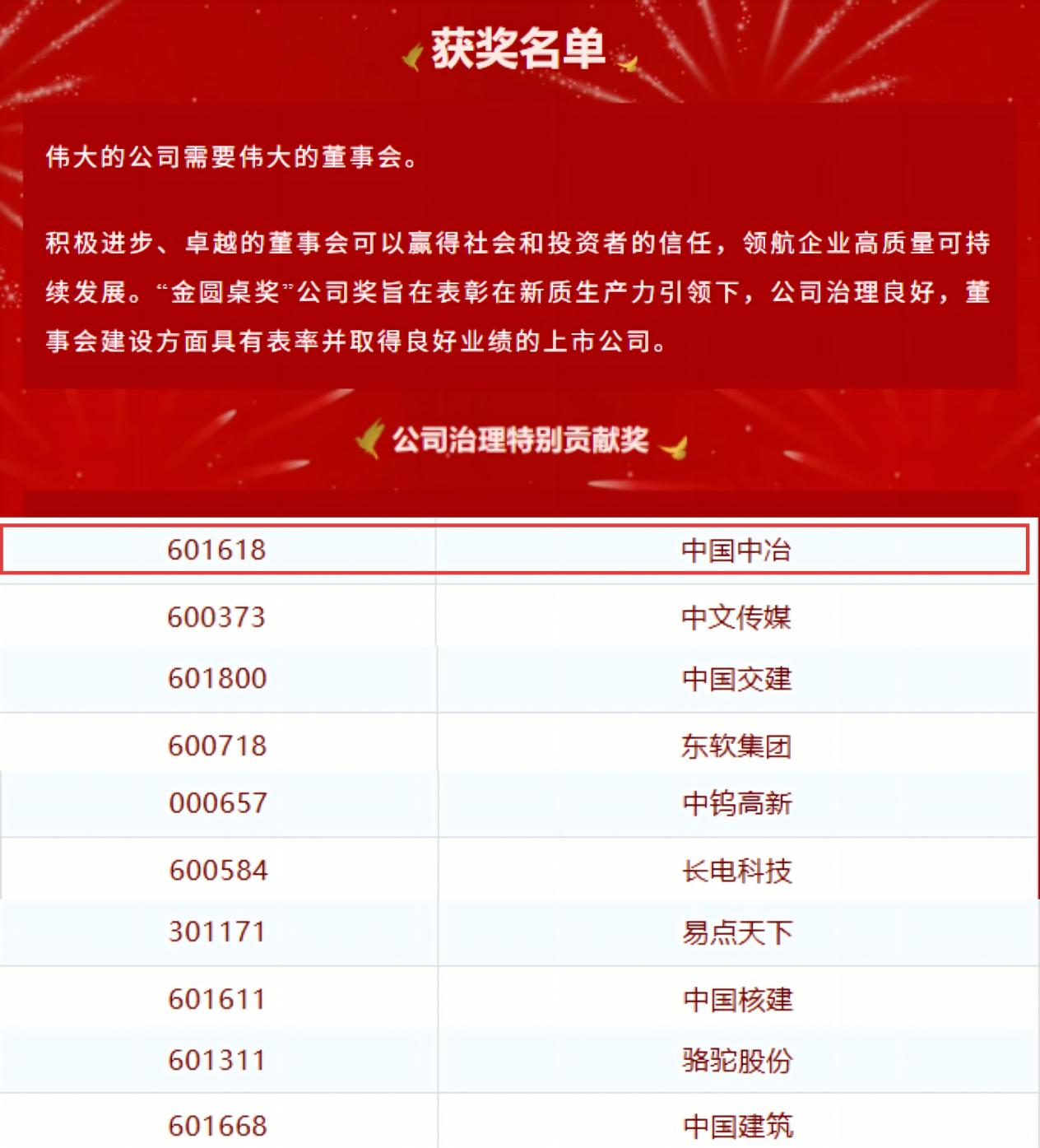 中國中冶榮獲第二十屆中國上市公司董事會“金圓桌獎﹒公司治理特別貢獻獎”殊榮